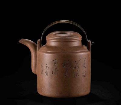 牛盖洋桶壶型约出现于清末,上海是较早西化的地方,宜兴距上海不远。紫砂匠人参考了西方人(洋人)使用的桶的形状制作壶身,将壶盖上挖两个类似牛鼻的孔眼,以“牛盖”命名,即为牛盖洋桶。这款壶高身、直桶形,容积较大,壶肩处有双耳,配以铜、锡所制提梁,最适宜沏泡红茶。