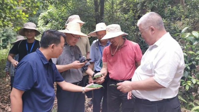 专家们在研究古茶树叶。