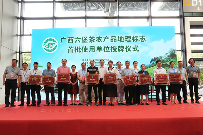 当天,广西茶业协会为39家首批“广西六堡茶”地理标志使用单位授牌。