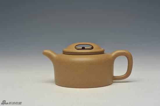 另一种莲子壶矮身筒,又称扁莲子。如同扁墩、仿古井栏的身型,壶钮变桥式为圆珠或牛鼻,冠名为平盖莲子或牛盖莲子。一直奇怪这种称呼的来历,多次向宜兴工艺师探问而无果。裴石民、顾景舟等前辈都曾制作过牛盖莲子,洋溢着典雅的书卷气。