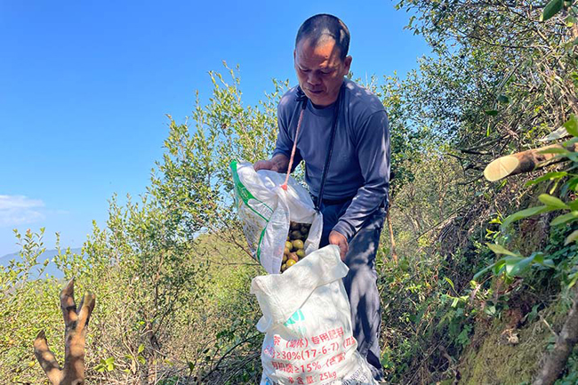 村民正在装运新采收的油茶果。