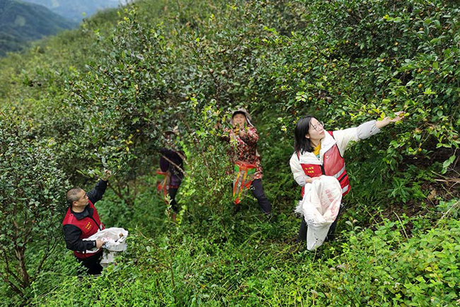 驻村工作队员正在帮忙茶农采摘茶油果。