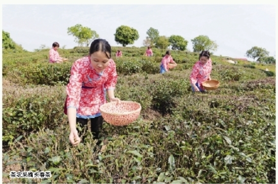 在山心镇蓬塘村的兴业县一千茶农茶叶专业合作社的茶园里,茶农们正在采摘头春茶。茶园里刚冒尖的茶芽、来回穿梭的茶农和带着寒意的春风,构成了一幅乡村特有的春天的画卷。