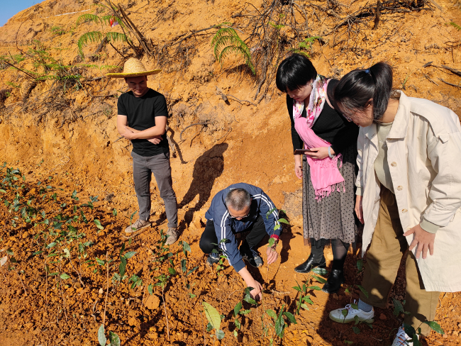 技术指导组对茶园业主及种茶工人在茶苗移栽、苗圃管理过程中遇到的问题进行详细解答,细致讲解标准化茶园技术规范并现场示范种植方法,为春季生态茶园建设提供技术支撑。在新种茶园种植技术方面,技术指导组专家们表示:一是要根据梯面大小选择最优的种植方式,注意行距、株距,种植穴间形成“品”字交错排列,使茶树在茶园中形成更为均匀合理的空间分布;二是在填土至深度约一半时,要将茶苗向上提动一下使根系舒展后再用力将土压紧让根与土紧密接触,然后继续填土压实,直至茶苗泥门处上方5cm处为宜;三是覆好土后浇定根水,浇足浇透;四是茶苗运回后应放在阴凉处喷水保湿,要防止风吹日晒、紧压堆闷,并及时种植,如不能及时种植,应用泥浆包裹根部并保持湿润,或进行假植;五是建议种苗繁育基地在气温较高时应拆除薄膜小拱棚,换用覆盖物保水或在白天温度高时,掀开拱棚两头通风降温。同时建议茶园完善灌溉系统,做好护坡措施,加强茶文旅融合规划,做好茶园内景观树种植、景观台设计,建设美丽茶园。