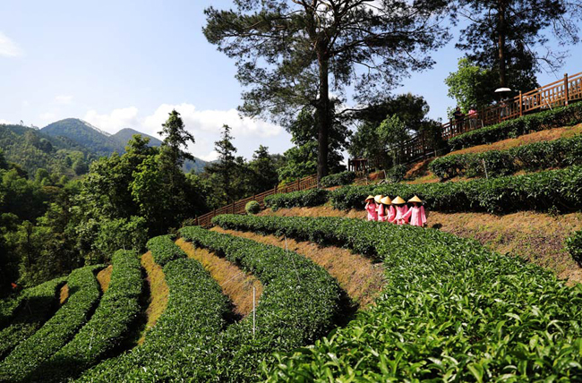 广西国有黄冕林场工会主席胡荣辉说:“我们最大的特色是林中有茶,茶中有花,林、茶、花相辅相成,突出绿色生态优势,同时我们还以茶产业带动400多名侨胞和600多名周边群众,增收致富,提升人民群众的幸福感。”