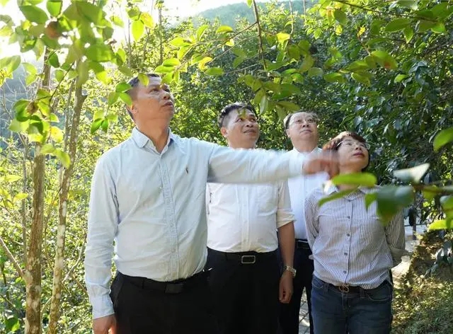 自治区人民政府副秘书长黄瀚(左一),自治区林业局党组成员、副局长陆志星(左二)调研高峰林场油茶种植基地。