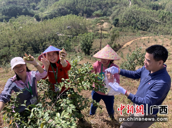 当下正值油茶果采摘季,在南宁市武鸣区两江镇明山村油茶基地,漫山遍野的油茶树郁郁葱葱,沉甸甸的油茶果挂满了枝头,村民们穿梭在油茶林间,娴熟地采摘油茶果。
