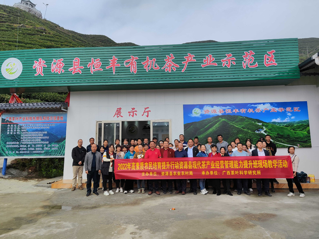 资源县具有得天独厚的资源禀赋,种茶历史悠久,茶文化底蕴深厚,县委县政府高度重视茶产业发展,近年来整合了各方力量和各种资源促进茶产业提质增效。此次培训以“理论讲授+现场实训+研讨交流+网上授课”模式开展,为期15天。课程设置了农业农村部1号文件及自治区农业农村厅《加快推进广西六堡茶及特色优势茶产业高质量发展实施方案》解读、桂花茶加工工艺及关键技术、六堡茶加工工艺原理、白茶加工理论知识与加工技术、名优绿茶和工夫红茶加工技术及其感官审评、资源历史与茶文化、手机“云上智农”APP操作及其应用等。并实地到资源县梅溪镇戈洞坪有机茶园示范基地、资源两水苗族乡红色教育基地、中峰特色有机产业种植基地进行现场教学。