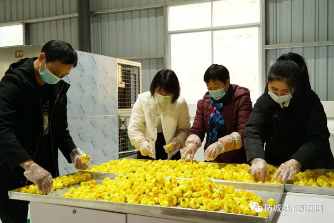 在大旺村金花茶产业园加工厂内,大旺村村党总支部书记、村委会主任李德彬和村民正在细心挑选品相好的金花茶,整齐地摆放在托盘里。“像这种呈杯状的花朵最佳,完全盛开的要定型才能保持它的花形。”李德彬向记者介绍,加工厂有3套金花茶冷干设备,现在平均每天收购约75公斤金花茶鲜花,到了采摘高峰期,收购的数量会翻倍。鲜花要经过急冻、真空冷冻干燥等工序,大概20多个小时能出炉。当前金花茶市场价为每公斤鲜花34元左右,冻干花按级别每公斤卖400~1000元。