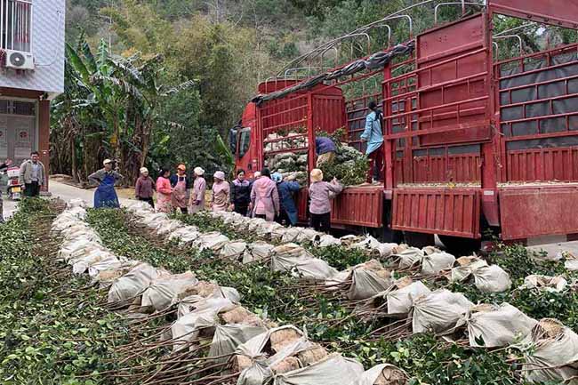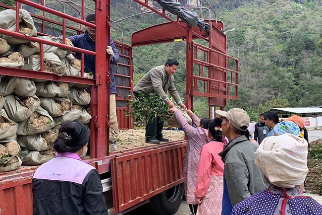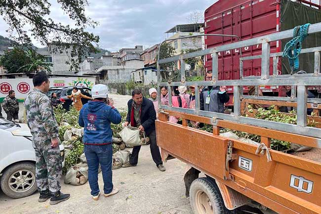 2月14日,河池市大化瑶族自治县羌圩乡那良村怀能屯人头攒动,村民们正在满载茶油苗的货车上,将一株株树苗卸下领走,场面十分热闹。这是该县组织的“送苗到家”活动,免费为群众发放优质油茶苗,还有技术人员现场教授种植技术。