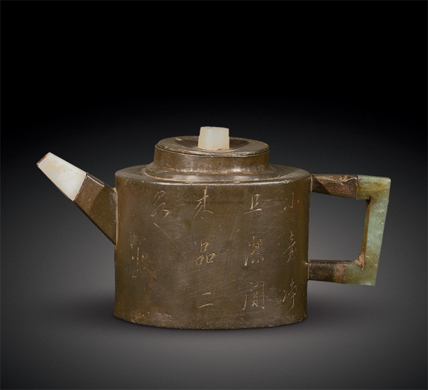 包锡工艺,俗称“砂胎包锡”。清中期朱坚(石梅)精于此术。常见形式有壶体全包或壶体包锡,嘴把镶金、镶玉、镶红木等。