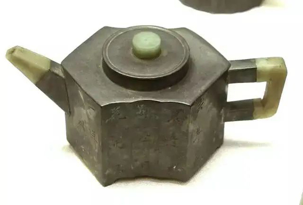 这种以铜锡合金质地装饰的方法为宜兴紫砂壶所特有。