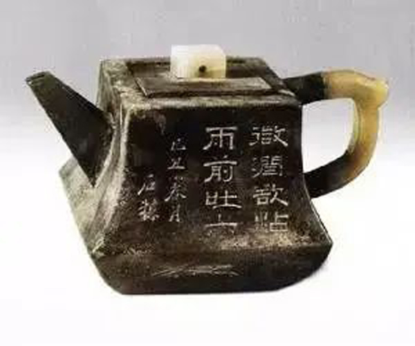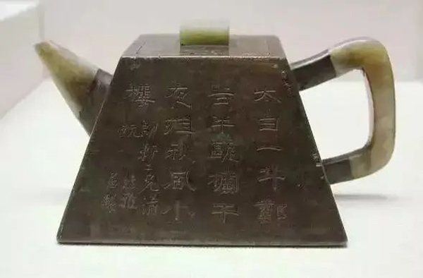 清道光时期紫砂胎刻书画锡壶。高8.4厘米,四方壶身呈斛形,折腹。紫砂胎外包锡皮,四角形短直流,镶螭虎形青玉环把,正方形盖面镶方形白玉纽。器身一侧刻牡丹纹饰,另一侧刻隶书:“微润欲沾,雨前吐尖。己丑小春月,石梅”,己丑年为清道光九年(1829)。