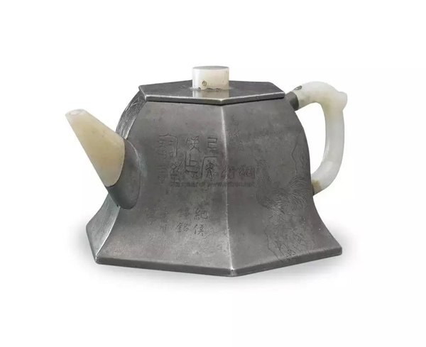 可见这种外面包锡的装饰风尚的确是朱石梅的首创。在包锡之后,在锡面上刻字,后用玉为纽、流和把,亦用硬木或玉器作把,这类壶多由杨彭年制作。由于壶底为锡所包,不能将款识印在底上,杨彭年还在壶内加泥块一方,印上自己的名字。当时运用这种方法所制作的紫砂壶颇为有名。但器物笨重,有损砂艺朴实之本色,故后世没有发展。但这种装饰方法,可谓开紫砂陶与其复合材料装饰紫砂壶之先河,对后世还是有影响的。这也算作19世纪早期朱石梅对紫砂壶艺所做的贡献!