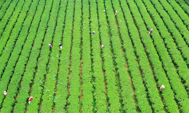 春暖茶飘香,茶农采茶忙。时下正值春茶采摘的大好时节,上林县明亮镇万古村大明山茶园里,一垄垄整齐的茶树郁郁葱葱,茶树吐露着嫩绿肥硕的新芽,在阳光的照耀下,充满勃勃生机。茶农们头戴帽子、身挎竹篓,在茶树丛中来回穿梭,手指在茶树间不停地翻飞,娴熟地将一个个嫩芽采摘下来,构成了一幅春来茶事忙的诗意画卷。