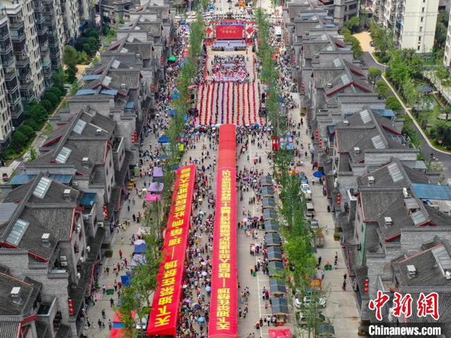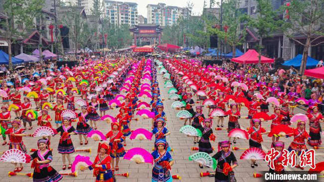 5月21日,千名瑶族同胞身穿瑶族盛装,唱起油茶歌,跳起油茶舞。(无人机照片) 杨宗盛 摄