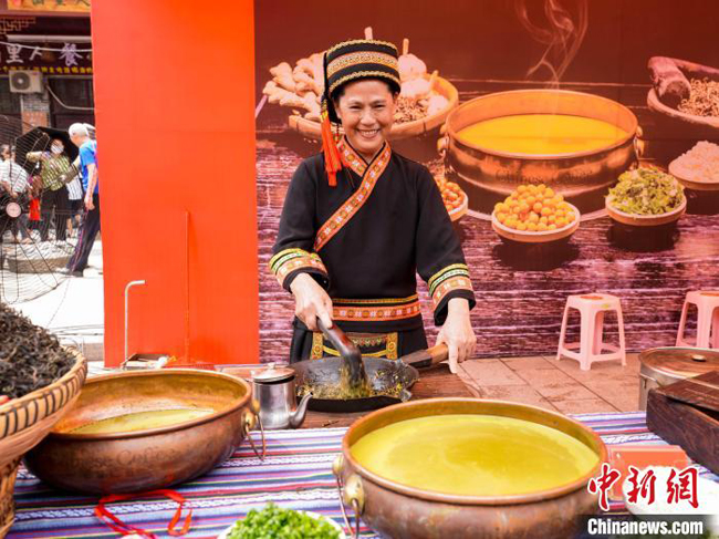 5月21日,在广西桂林市恭城瑶族自治县油茶小镇,恭城油茶网红店凤凰山斑鱼馆员工现场展示打油茶。杨宗盛 摄