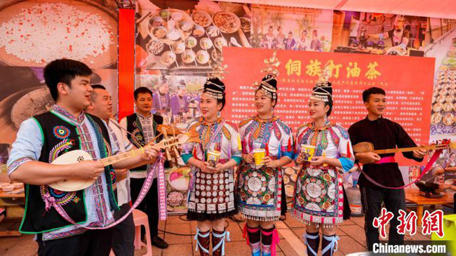 5月21日,在广西桂林市恭城瑶族自治县油茶小镇,三江侗族油茶展台的少数民族同胞在演绎琵琶弹唱。 杨宗盛 摄