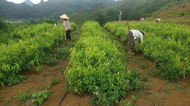 农户在巴马瑶族自治县那桃乡村集体经济甜茶产业基地管护甜茶苗