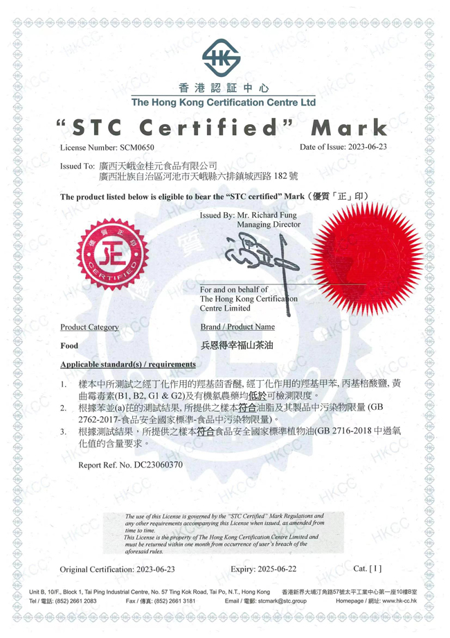 近日,记者从天峨县市场监督管理局获悉,该县“兵恩.得幸福”山茶油日前获香港标准及检定中心(STC)颁发的香港优质“正”印认证证书。这标志着“兵恩.得幸福”山茶油取得了香港的质量通行证。
