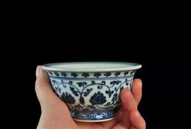 杯:1)压手杯:口平坦而外撇,腹壁近于竖直,自下腹壁内收,圈足。以明永乐青花压手杯为典型。