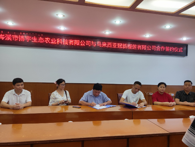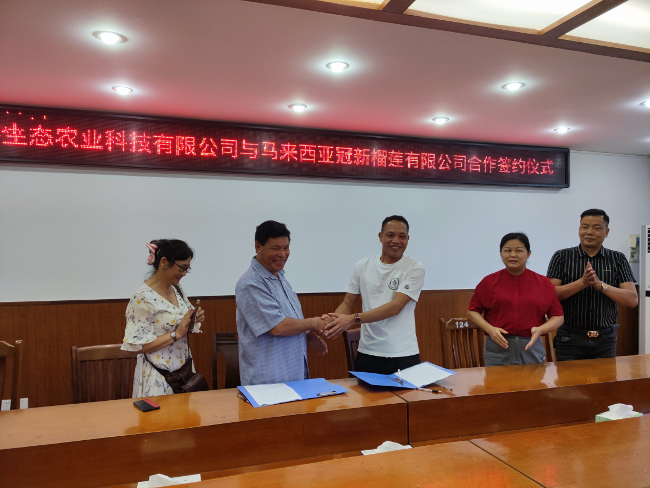 日前,岑溪市博宇生态农业科技有限公司与马来西亚冠新榴莲有限公司成功签订水汶镇榴莲、六堡茶产业基地项目投资合作框架协议,进一步促进我市发展特色产业,助力乡村振兴。