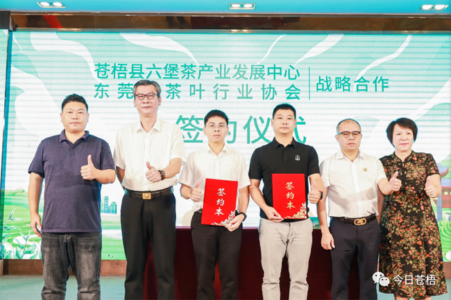 活动现场,在众多嘉宾的共同见证下,苍梧县六堡茶产业发展中心与东莞市茶叶行业协会签订了战略合作协议,进一步探索合作共赢的无限商机,为六堡茶及两地茶行业的蓬勃发展注入新动能。品鉴会上,苍梧县六堡茶产业发展有限公司、苍梧县沁怡六堡茶业有限公司、广西大营六堡茶有限公司、梧州市六茗茶业有限公司、苍梧县六堡镇启源盛六堡茶专业合作社、梧州市村姑六堡茶有限公司、苍梧县六堡镇黑石山茶厂7家企业分别做了推介,就苍梧六堡茶的历史文化、品牌故事、产品优势等进行推荐介绍,让在场的嘉宾进一步了解了苍梧六堡茶产业的发展情况,同时邀约各界朋友多到苍梧观光旅游、品茶赏茶,领略苍梧六堡茶的独特魅力,共享苍梧六堡茶发展的无限商机。
