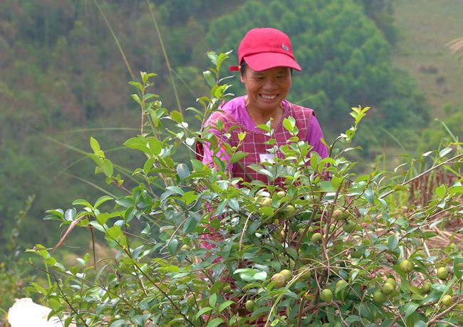“我家以前种有老茶树2亩多,一年一亩也有两千多元的收入。从2019年开始改种了3亩多的新品种茶果,新品种茶果今年正式收果摘收,今年全部收成约有一万元。种植油茶,村里有了榨油坊,不用担心油茶果没人要,不愁销路。”韦连芬说。
