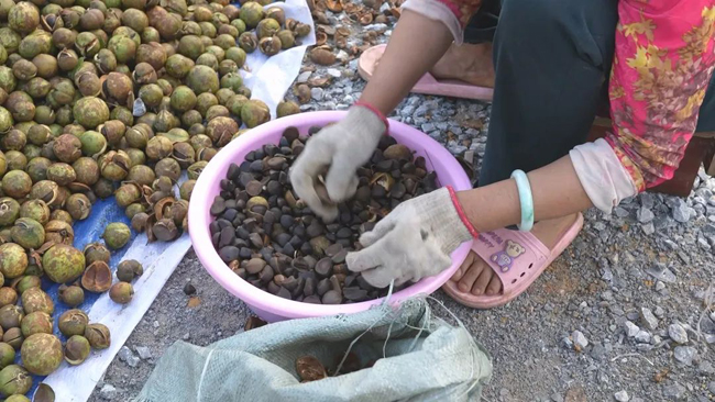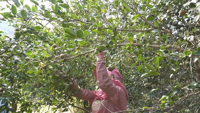 “我这个茶果从山上捡回来我都拿来这里来卖了,很方便。”农户姚七说。农户金有伍告诉记者:“茶果的多的时候,一些老板就开农用车穿梭在油茶林的公路上收茶籽,群众现卖现结。”