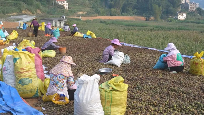 时下巴马油茶迎来了采摘季,不少农户看准商机,在家门口建起油茶收购点,外地客商闻讯纷至沓来,进村入户收购油茶籽,呈现采收两旺的好“钱”景。