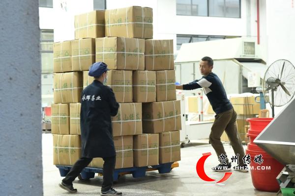 图为工人们正在搬运包装好的茶叶