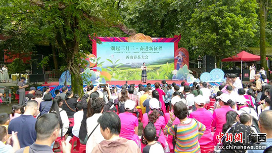 采茶舞、炒茶师傅现场炒春茶、禅茶茶艺表演,现场品西山茶香,游西山景区。这是4月13日,在桂平西山风景名胜区举行“广西三月三•八桂嘉年华”活动现场。