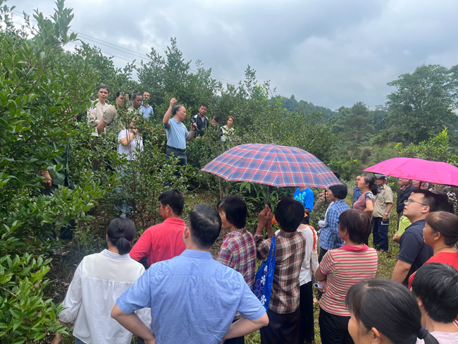 在培训课上,授课老师从油茶品种、种植技术要点、管护注意事项等方面进行讲解,并与现场群众到油茶林地查看植株生长情况,并进行现场授课。