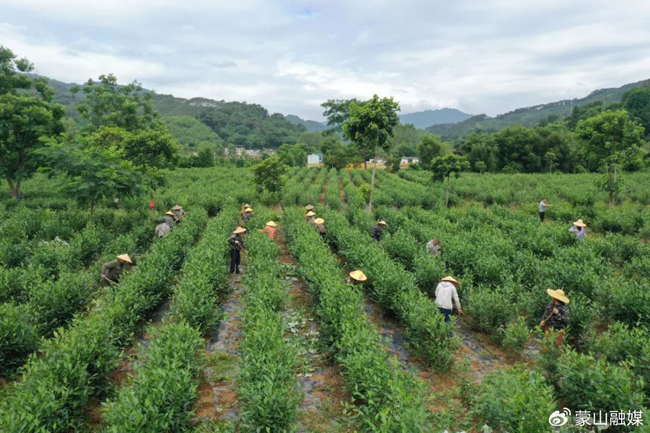 近段时间以来,蒙山县黄村镇圣官茶岛上一片繁忙景象。在这片150多亩葱翠的茶园里,除草、修剪、施肥的管护工人们身影穿梭,他们挥洒的汗水,滋润着这片充满希望的“绿色银行”。6月12日,记者走进茶岛,亲身感受了这片生态茶园日间热火朝天的管护劳动场景。