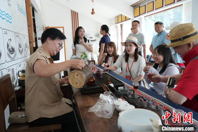 图为媒体代表品梧州六堡茶。梁恺琦 摄