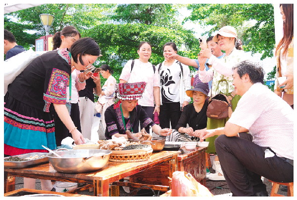 活动现场茶香四溢,人潮涌动。精心设置的产品展示区集中陈列了恭城油茶、恭城月柿及各类特色油茶茶点。非遗演示区内,恭城油茶非遗传承人周黎维娴熟展示传统“打油茶”技艺,浓郁茶香吸引了大批深圳市民驻足观赏、争相品尝。