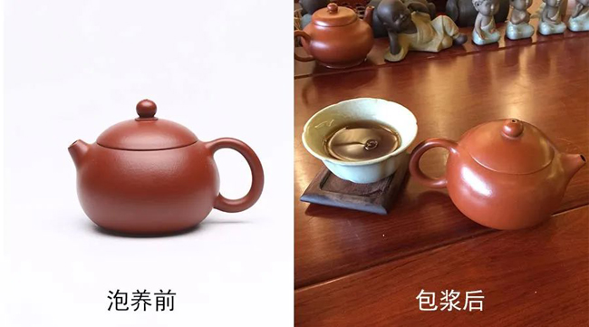 这张照片是以前朋友找六一堂入的西施壶,泡养前后的对比!朱泥养好了还是很漂亮的。