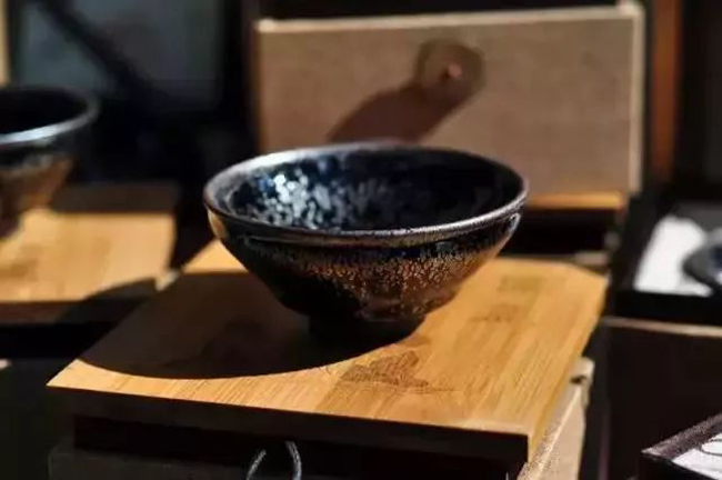 建盏。建盏是汉族传统名瓷。为宋朝皇室御用茶具。都用正烧,故口沿釉层较薄,而器内底聚釉较厚;外壁往往施半釉,以避免在烧窑中底部产生粘窑;由于釉在高温中易流动,故有挂釉现象,俗称“釉泪”、“釉滴珠”。这是建盏的特点之一。