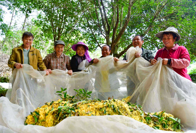 在龙脊镇大柳村的桂花林里金浪翻滚,香气氤氲。花农们正忙着采摘饱满的桂花,脸上满是丰收的喜悦。“这片桂花我种了20多年,近两年来年产稳定在2000斤左右,年收入能有一两万元。自从茶叶厂落地,咱们的桂花再也不愁卖,销路稳稳的!”大柳村花农肖美凤笑着说道。