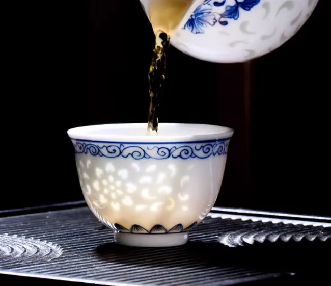 玲珑瓷创烧于明宣德年间,是在镂空工艺的基础上创造和发展起来的。玲珑瓷是在细薄的坯胎上,按照图案设计的花形,镂雕成许多米粒状的孔,然后施以透明釉再通体施釉,入窑烧制而成。烧成后的孔眼明澈透亮,十分美观。清代瓷工们把青花瓷和玲珑瓷巧妙地结合起来,烧制出独一无二的青花玲珑瓷。碧绿透明的玲珑和色呈翠兰的青花互相映衬,精美绝伦。