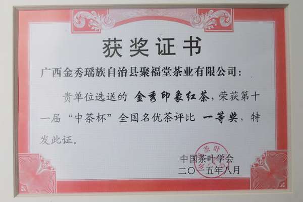 在2015年度举行的第十一届“中茶杯”全国名优茶评比(第一阶段)活动中,金秀县选送的两个红茶茶样都荣获红茶类一等奖,这两个红茶茶样分别是广西金秀县瑶山王茶业有限公司香哩歌牌红茶和广西金秀瑶族自治县聚福堂茶业有限公司金秀印象红茶。