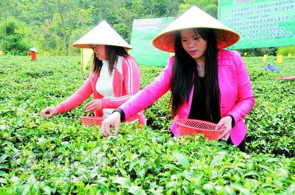 浦北县谱好产业扶贫曲,把茶叶产业做强做大,全县目前1.1万亩春茶开采,预计仅春茶一项产值就可达5500万左右,惠及全县1200户贫困户。图为浦北县三合镇贫困村新村村委路头碑村的姑娘在采摘春茶。