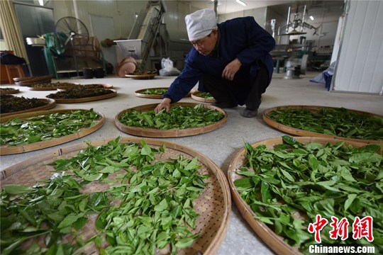 图为4月15日,工人在广西三江侗族自治县良口乡和里茶厂将野生茶叶进行摊青。 杨明 摄