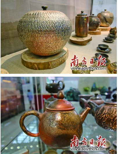 记者在现场近距离观赏吴金维的作品,发现不管是茶壶、茶罐、茶托和茶杯,尽管没有上釉,但件件都能不同程度地体现出一般在瓷器身上才可能出现的流光溢彩的 美学特征,除了独家的金、银之外,还有红色、橘色,有些茶器身上,还能看到细腻的蓝、紫、黝黑渐层,所有作品都能够明显看到高温变化的火痕,而器皿表面的 肌理则千变万化,有鱼鳞纹,也有蜘蛛细纹,还有亮丽的闪光,器皿胚体迎火面上所聚积生成的落灰、结晶花。