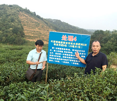 近期,广西东方美人茶业有限公司计划申请富硒茶认定, 梧州市土肥站及时跟进,积极开展富硒茶开发技术指导服务。2016年10月10日,市土肥站站长黄华平会同外源硒生产企业技术员再次来到该公司基地旭村茶园,现场培训茶叶富硒生产技术,面对面指导含硒水溶肥料叶面喷施的方式方法,为广西东方美人茶业有限公司申请富硒茶认定提供技术保障。