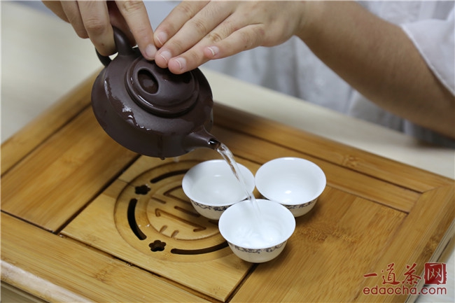 揭盖,注入八九分满的开水,数十秒之后将茶汤注入茶杯之中。