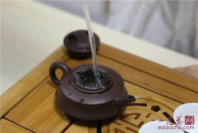 揭盖,投入适量茶叶,缓缓地注入开水直至茶水稍稍溢出,用壶盖轻轻刮去茶末、然后盖上,再用开水将壶体外部淋一遍;数十秒之后,将茶汤倒入茶杯之中,稍微摇晃一下然后倒掉。