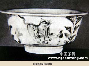 这件青花瓷乳虎纹茶碗,大约是15世纪时明代景德镇民窑产的饮茶用具。该碗装饰画面用线活泼,纵笔挥洒,给人一种新鲜活泼的美感。乳虎的描绘生动活跃,笔调酣畅,气韵天成,给人以栩栩如生之感。