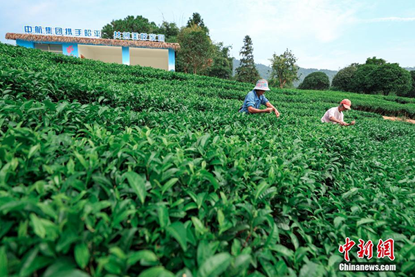 10月28日,广西昭平县江口村生态茶示范基地内,茶农在采摘茶叶。该茶园基地总面积86亩,由中航集团帮扶援建,以生产“生态有机茶”为发展定位。目前该茶叶基地已经进入采摘期。